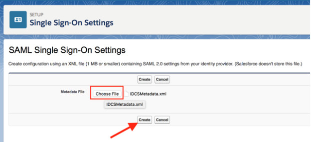 6. Select the downloaded metadata XML file (created in step 1) using the Choose File button. Click on Create.