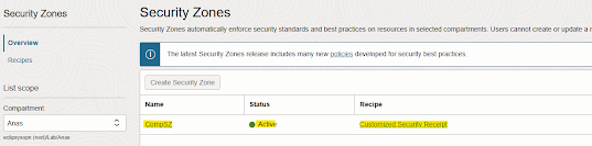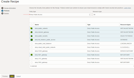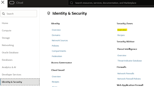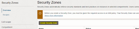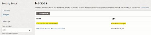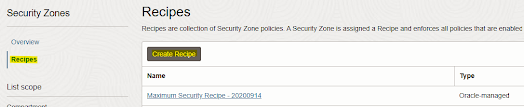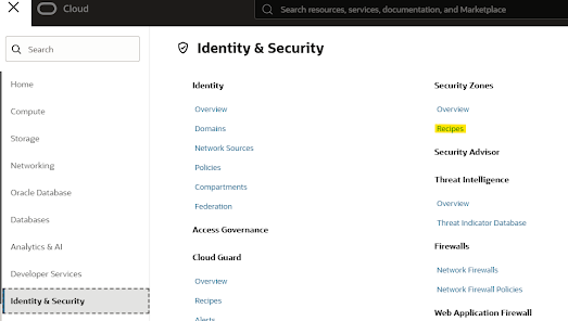 Open the navigation menu and click Identity & Security. Under Security Zones, click Recipes.