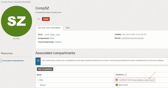 If the compartment or any sub-compartment has any policy Violations, select View details in Cloud Guard.