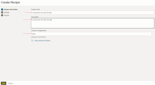On the Recipe information page, enter a name and description for the recipe, and select the right compartment, then click Next.