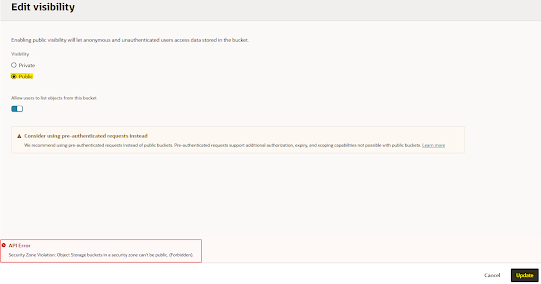 In my example, I'll edit the visibility for the OCI object storage bucket, which resides in the same compartment that has the security zone enabled, to be Public. This change will fail because it violates the security zone rule "