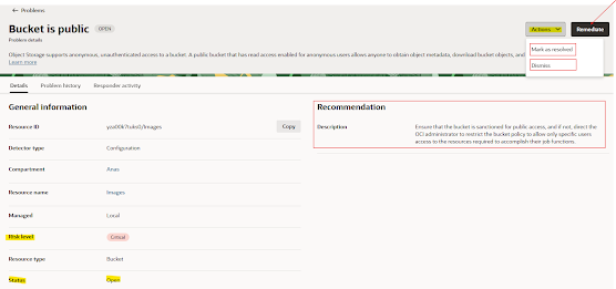 3. Select a problem to view details. For example, select the first problem "Bucket is public". You can either click Remediate to resolve the problem (clear violation), Mark as resolved, or Dismiss.