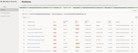 The Problems page in Cloud Guard opens and displays problems detected in this security zone only.