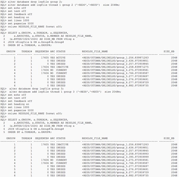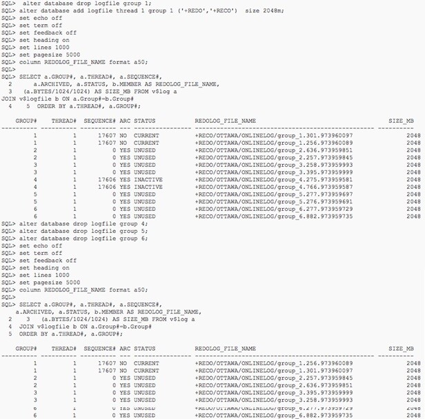 In this case, we would like to have one member per log group spread across +REDO & +RECO disk groups. Our intention in this case is to keep 3 online redo log groups.