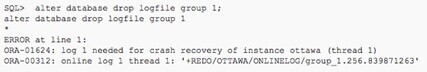 Before we do so, we need to check whether the log group we want to drop has the attributes of “ARC=YES” and “STATUS=INACTIVE” or “STATUS=UNUSED”.