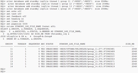 SQL> alter database add standby logfile thread 1 group 15 ('+REDO','+RECO') size 2048m;
