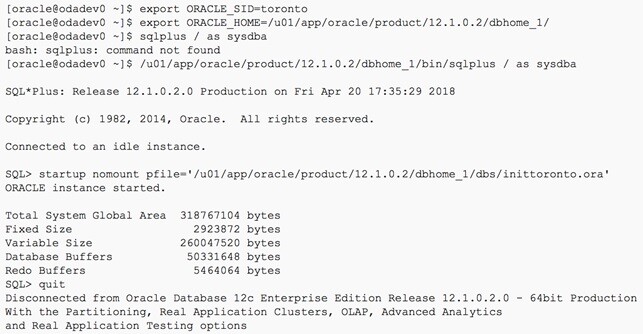 21. Start the auxiliary instance on ODADEV0 using the pre-created init.ora file