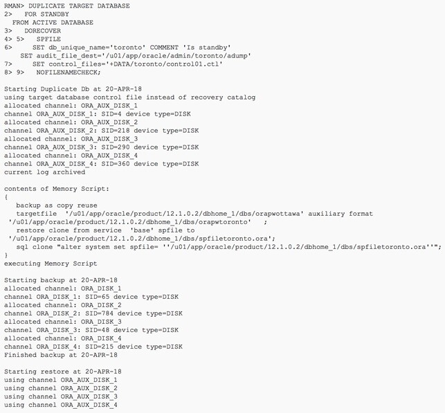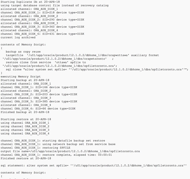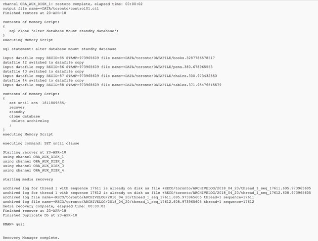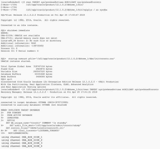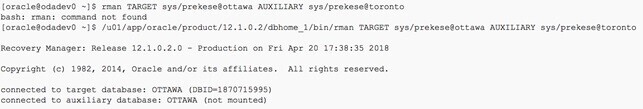 [oracle@odadev0 ~]$ rman TARGET sys/prekese@ottawa AUXILIARY sys/prekese@toronto