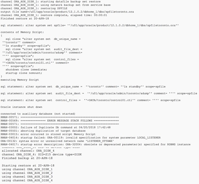 The error in the attached is requesting for a proper definition of the “LOCAL_LISTENER” parameter defined in the spfile automatically copied from the primary DB. Since we are on the “toronto” db, the parameter must be adjusted accordingly in the duplicate command.