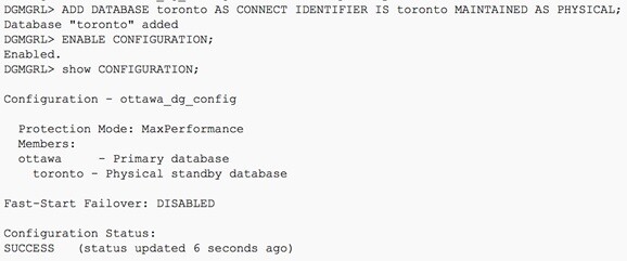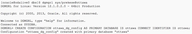 DGMGRL> CREATE CONFIGURATION ottawa_dg_config AS PRIMARY DATABASE IS ottawa CONNECT IDENTIFIER IS ottawa;