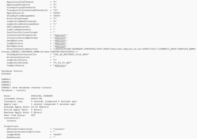 DGMGRL> SHOW DATABASE VERBOSE ‘toronto’;