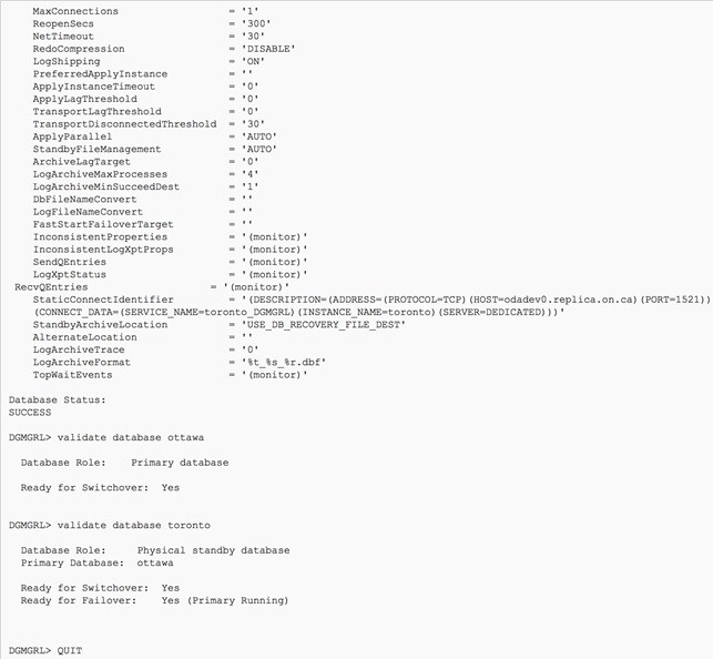 26. Now still on ODALIVE0 we add “toronto” DB to the DG configuration, enable and verify the configuration