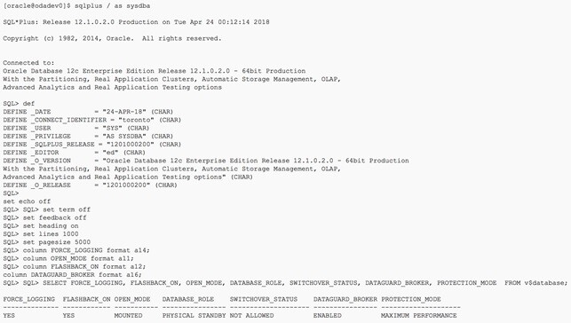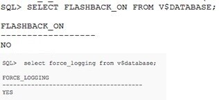 SELECT FORCE_LOGGING, FLASHBACK_ON, OPEN_MODE, DATABASE_ROLE, SWITCHOVER_STATUS, DATAGUARD_BROKER, PROTECTION_MODE FROM v$database;