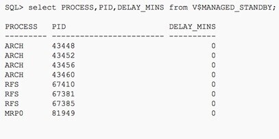 SQL> select PROCESS,PID,DELAY_MINS from V$MANAGED_STANDBY;