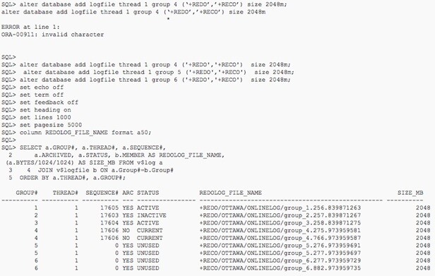 SQL> alter database add logfile thread 1 group 1 ('+REDO','+RECO') size 2048m;