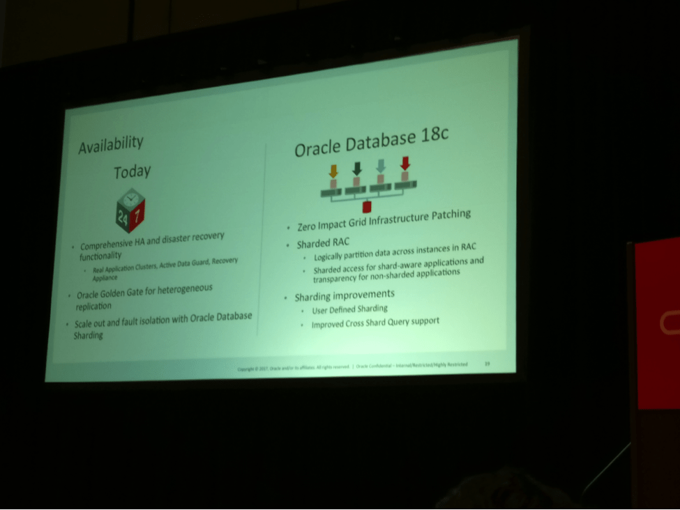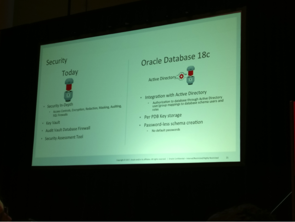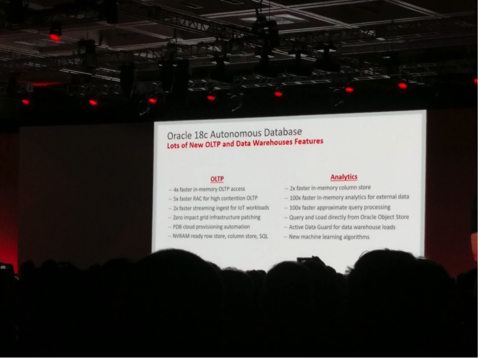 Another exciting session was “What’s New in Oracle Database 18c” by Dominic Giles and Penny Avril, both product managers for the database at Oracle. Regardless of the “autonomous database”, Oracle 18c will be packed with new features, some of which are: