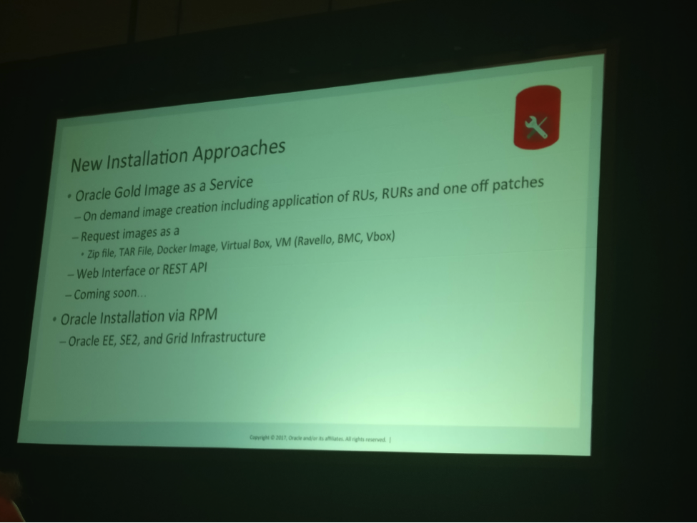 As shown above, many new installation approaches are coming soon. The one I’m most excited about is Oracle installation via RPM. Oracle already made some good improvements over the years with, for instance, the possibility to automatically configure Oracle Linux with preinstallation RPM: yum install oracle-rdbms-server-12cR1-preinstall. But the installation is still a very manual process, especially if you use the GUI. How cool will it be to just type: yum install oracle…