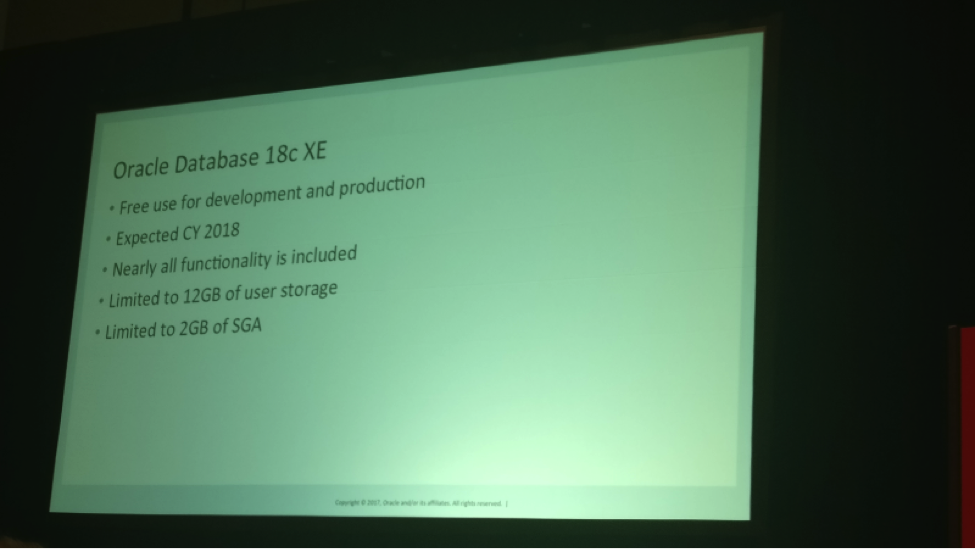 Finally, Oracle will release a new version of the Express Edition (XE) of the database. The Express Edition 11g was released many years ago and now we know that the 12c release will be skipped in favor of the 18c version. The Express Edition of the database is capped in storage and memory but offers a lot of functionality (nearly all functionality for 18c XE) and is completely free – even for production use. It can be a great starter database for students, developers and DBAs and can even be used by Independent Software Vendors (ISVs) and hardware vendors to distribute an Oracle database with a small footprint free of charge.