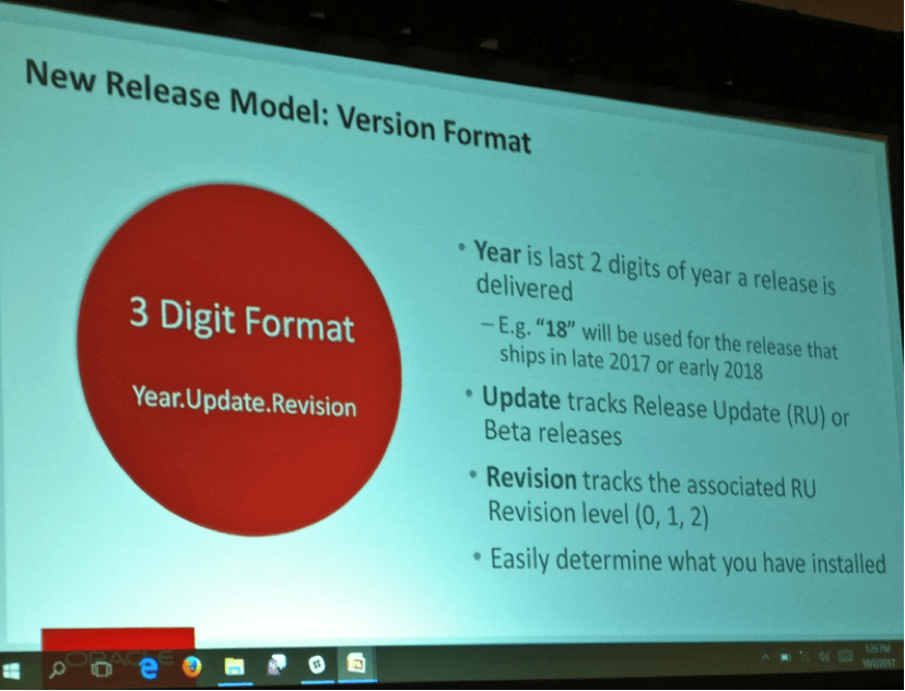 Because of the new release cycle, the version format will dramatically change to display the yearly release, RU and RUR as you can see below:
