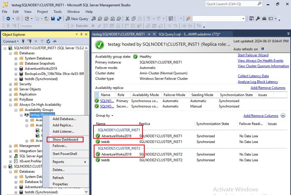 2. Always On Availability Group (AG): Set up an AG with at least one primary replica and one secondary replica, and Ensure the AG is synchronized and healthy.