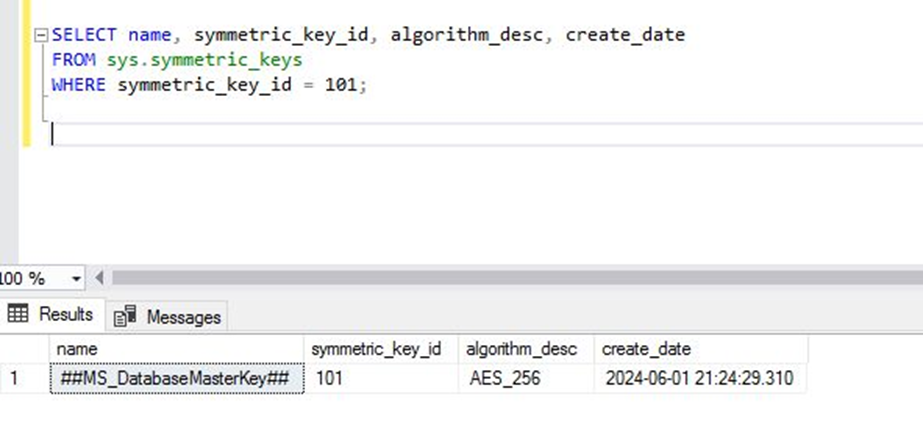 USE master; GO -- step 1 CREATE MASTER KEY ENCRYPTION BY PASSWORD = 'Amir123/*-Password123/*-'; GO -- check master key is created SELECT name, symmetric_key_id, algorithm_desc, create_date FROM sys.symmetric_keys WHERE symmetric_key_id = 101;