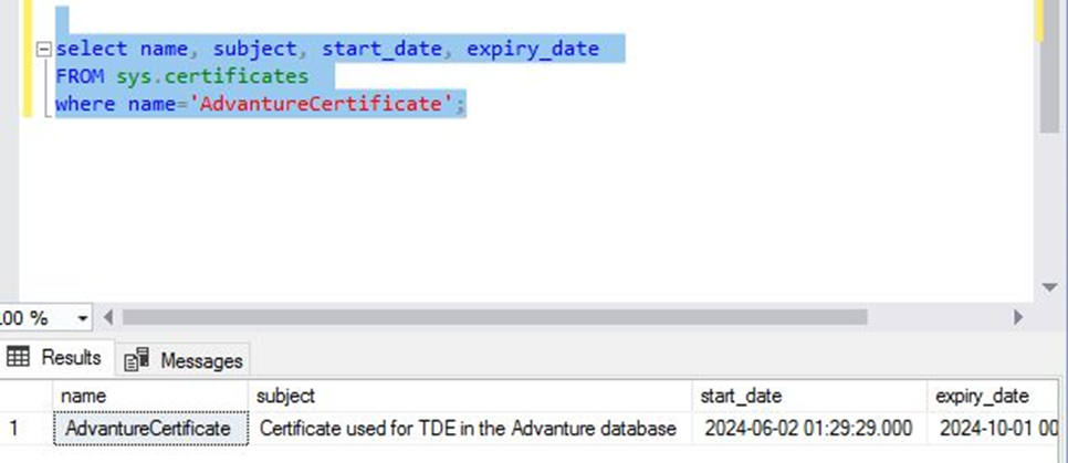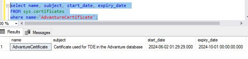 CREATE CERTIFICATE AdvantureCertificate WITH SUBJECT = 'Certificate used for TDE in the Advanture database', EXPIRY_DATE = '2024-10-01'; GO -- Check the certificate is created select name, subject, start_date, expiry_date FROM sys.certificates where name='AdvantureCertificate';