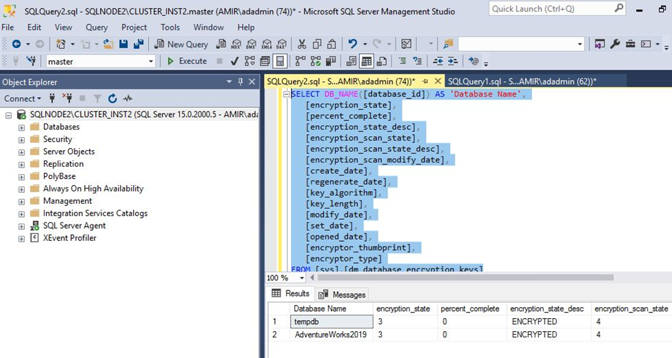 Now, you can see that the AdventureWorks2019 database is encrypted in both primary and secondary replicas.