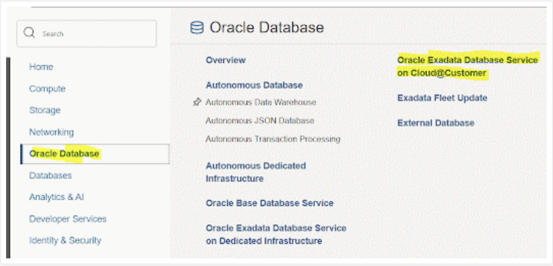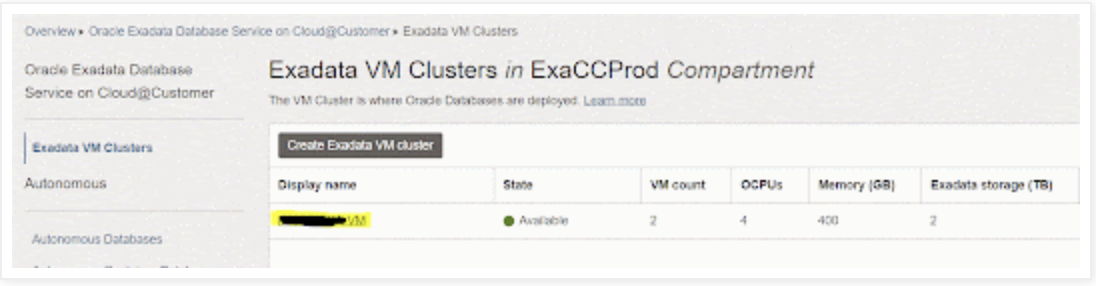 2. Navigate to “Oracle Database” > “Oracle Exadata Database Service on Cloud@Customer” > “Exadata VM Clusters“.