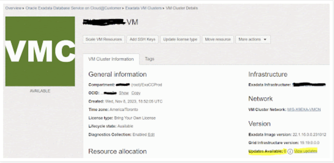 4. On the VM Cluster details home page, next to “Updates Available” click the “View Updates” link.
