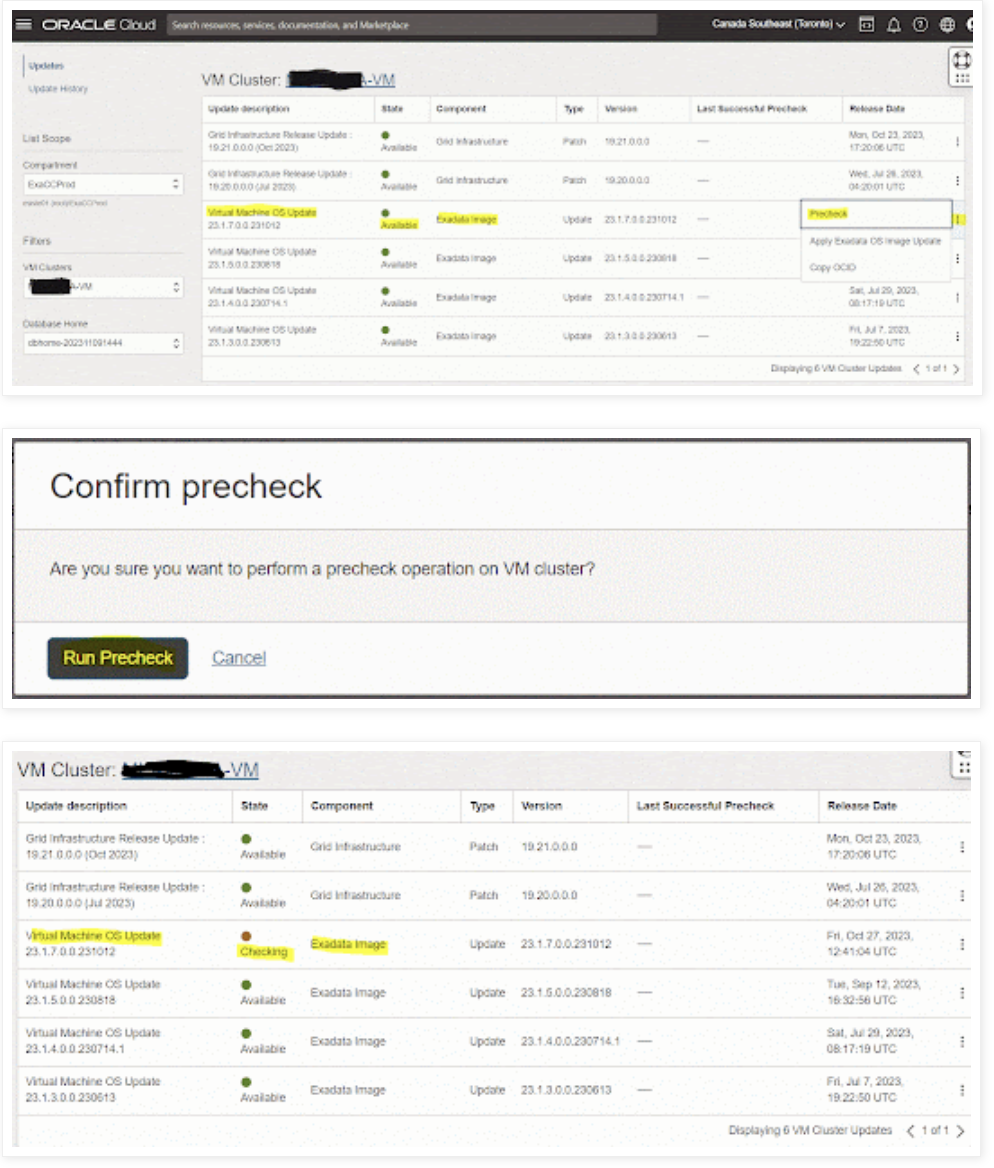 – Review the list of available software updates. Click the Actions icon (three dots) at the end of the row listing the patch you are interested in, and then click the “Precheck” action, then run the “Run Precheck” button in the confirm precheck screen.