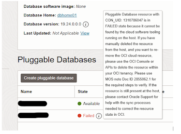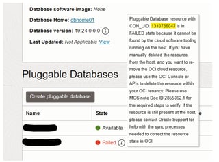 - Meta Link Note: Pluggable Database (PDB) Resource Shows Failed Status in Cloud Console While It Is Available in VM (Doc ID 2855062.1).