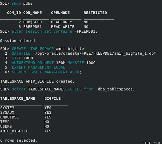 By default, when we create a tablespace in Oracle 23ai, it will be a Bigfile Tablespace.