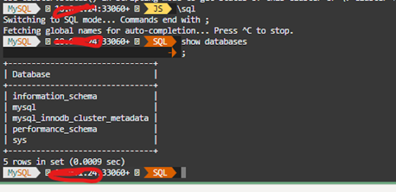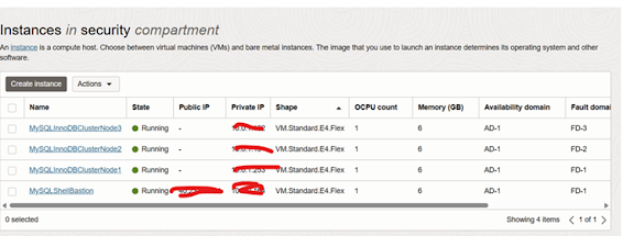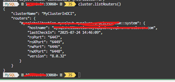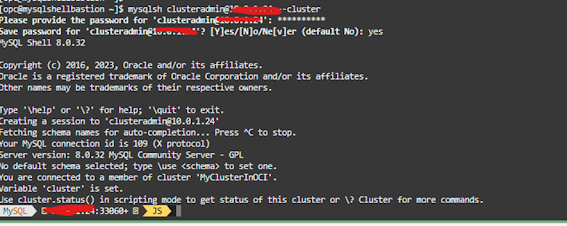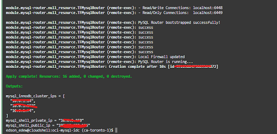 After successful provisioning of the MySQL InnoDB cluster, you will see the IP addresses of the cluster nodes and the Bastion/MySQL router server.