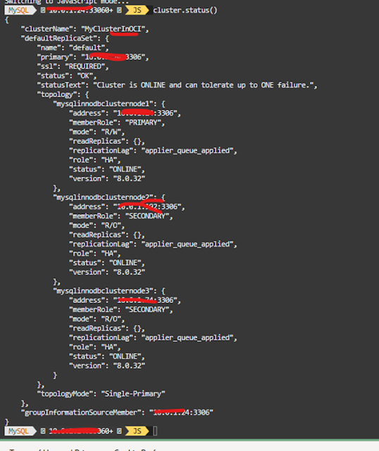 Check InnoDB Cluster Status to confirm the Primary and Secondary Database Instances
