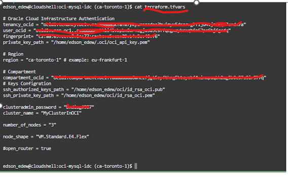 Below is my terraform.tfvars file after updating it with the details of my OCI environment.