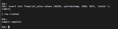 SQL> insert into financial_sales values (00359, systimestamp, 5000, 9875, 'Avatar');
