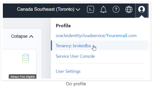 $ cat /c/Users/brokedba/.oci/config [DEFAULT] user=ocid1.user.oc1..aaaaaaaayd2yf6ru5xxxxxxxxxx fingerprint=bf:3b:2e:48:a2:98:xx:xx:xx:xx:xx:xx:xx key_file=C:\Users\brokedba\.oci\oci_api_key.pem tenancy=ocid1.tenancy.oc1..aaaaaaxxxx region=ca-toronto-1