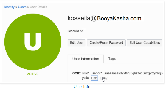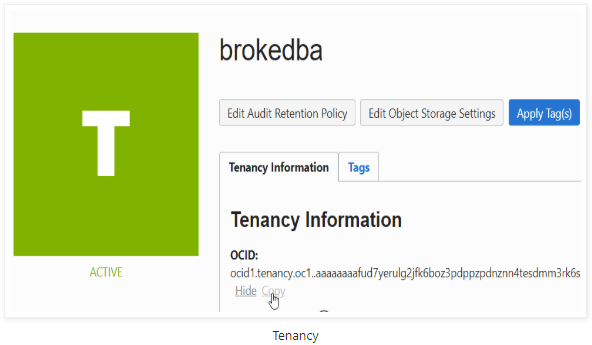> Click copy under the tenancy information’s OCID field. Save in your notepad.