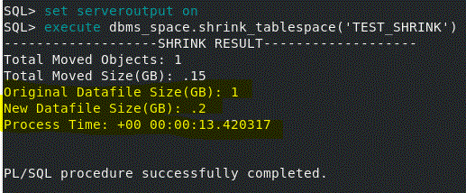 execute dbms_space.shrink_tablespace('TEST_SHRINK')
