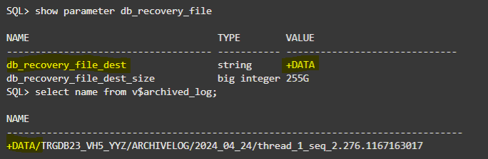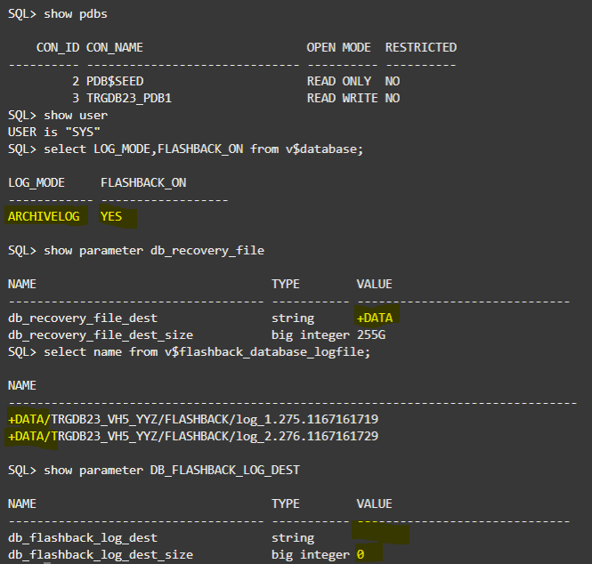 - Notice that the FRA destination is +DATA, and flashback logs were generated in FRA (+DATA)