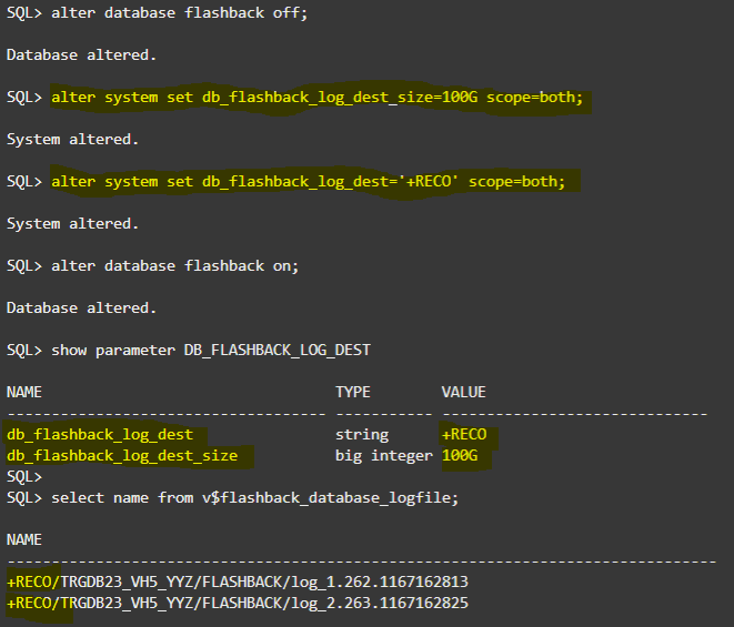 SQL> alter system set db_flashback_log_dest_size=100G scope=both; SQL> alter system set db_flashback_log_dest='+RECO' scope=both;