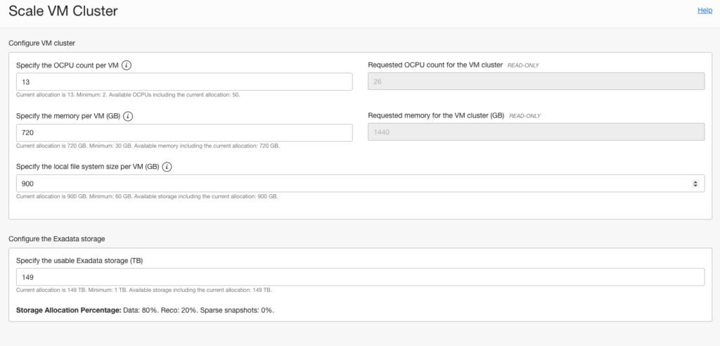 We can specify CPU, Exadata storage, memory, local filesystem size per cluster. But it is not only that. If you try to go to the page of scaling the existing cluster it has all those values. So, you should be able to scale up and down OCPU, memory and storage allocation for your VM.
