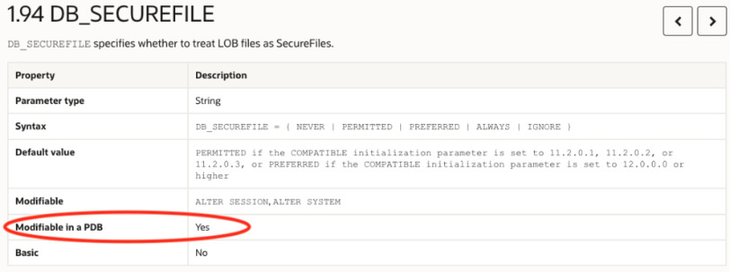 testdb021> ALTER SESSION SET container=pdb02; SESSION altered. testdb021> ALTER system SET db_securefile='PREFERRED' sid='*' scope=spfile; System altered. testdb021>
